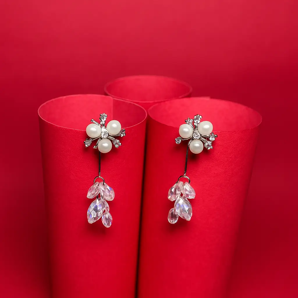 These beautiful drop earrings feature a delicate flower design with pearls and sparkling crystals, paired with iridescent crystal drops. Perfect for weddings, parties, or any special occasion, these earrings add a touch of grace and glamour to your look.