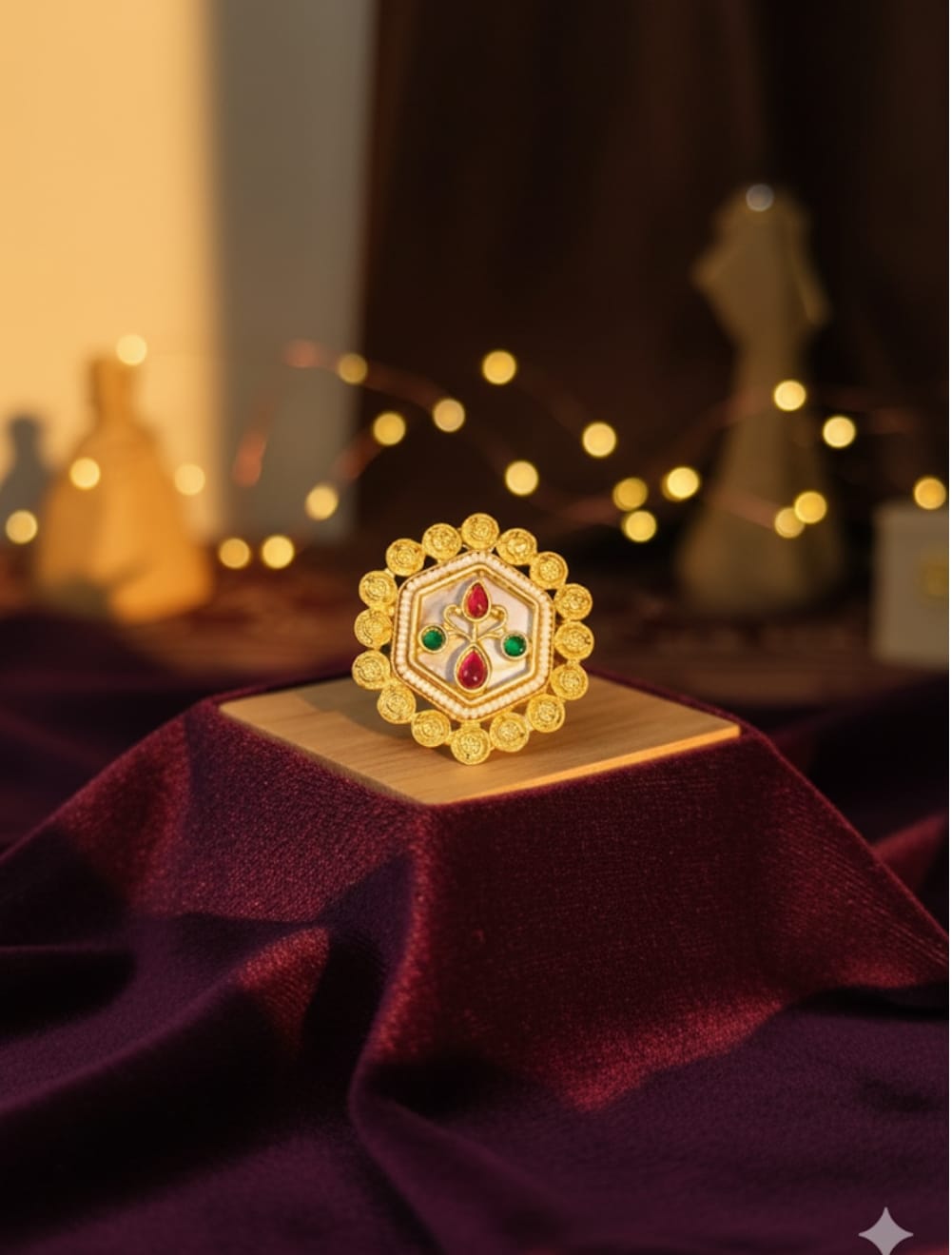 Elevate your festive and bridal look with this Gold-Plated Hexagon Kundan Ring with Red & Green Stones. Designed with intricate detailing, this handcrafted statement ring features a royal hexagon pattern bordered with golden floral motifs. At the center, radiant red and green stones add a touch of traditional elegance, making it a perfect accessory for weddings, parties, and cultural celebrations. Lightweight yet bold, this Kundan ring blends heritage with modern charm, making it a must-have addition to your ethnic jewelry collection.