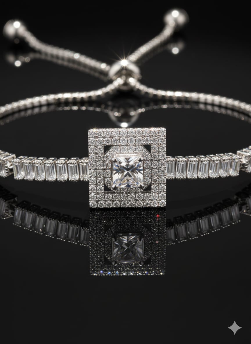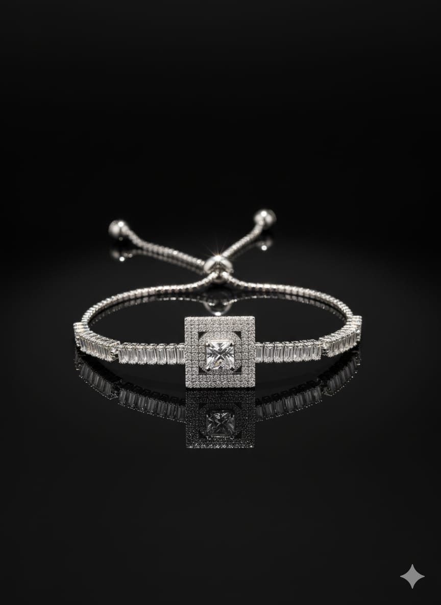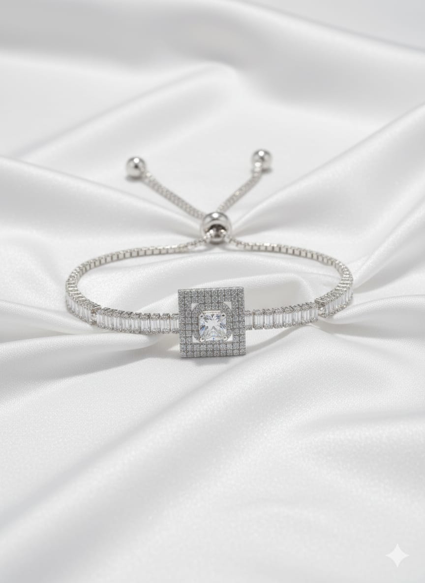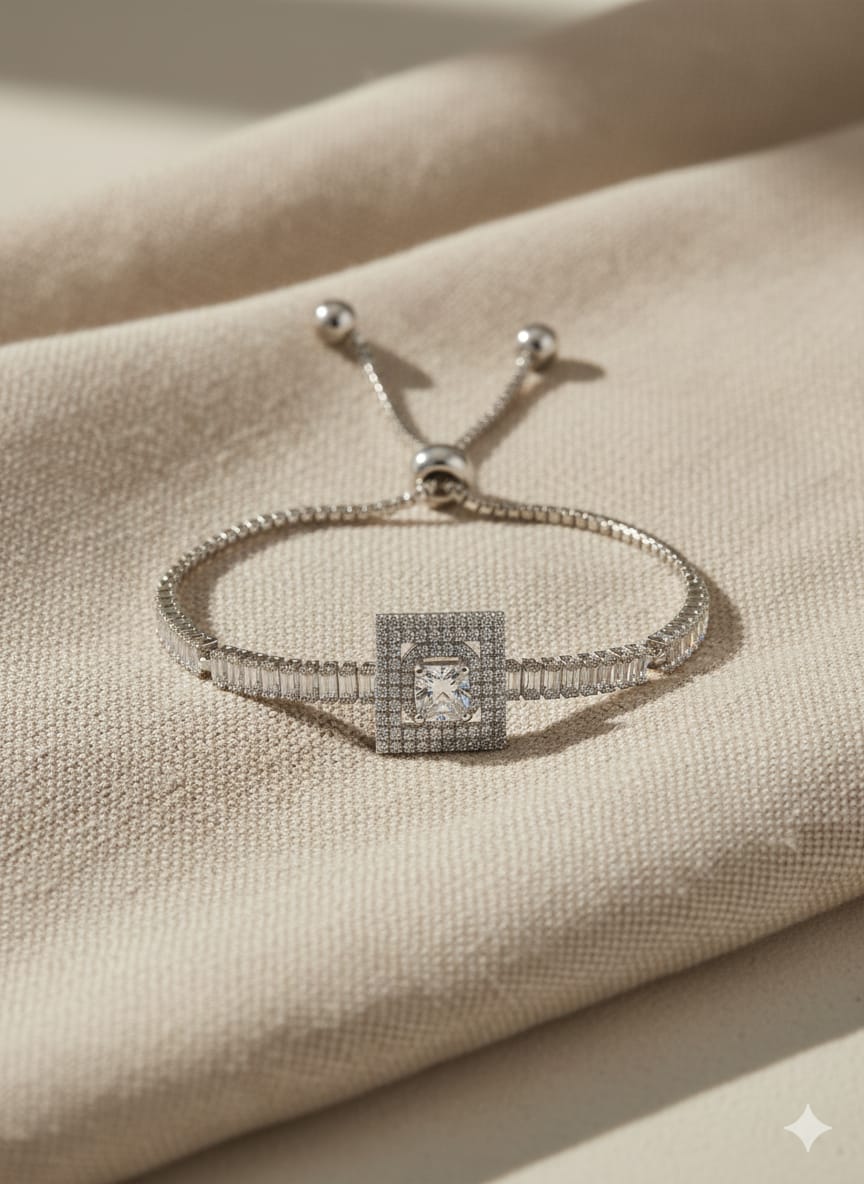Be the first to review “Princess Cut CZ Silver Bracelet | Square Halo Adjustable Tennis Bangle for Girls & Women”