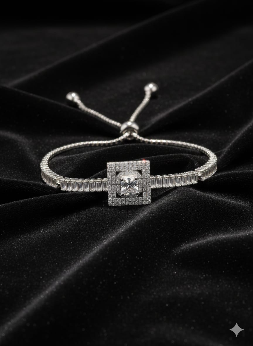 Princess Cut CZ Silver Bracelet featuring a sparkling cubic zirconia centerpiece in a unique halo setting with baguette side stones. Adjustable fit, elegant shine – perfect for party, festive & daily wear.