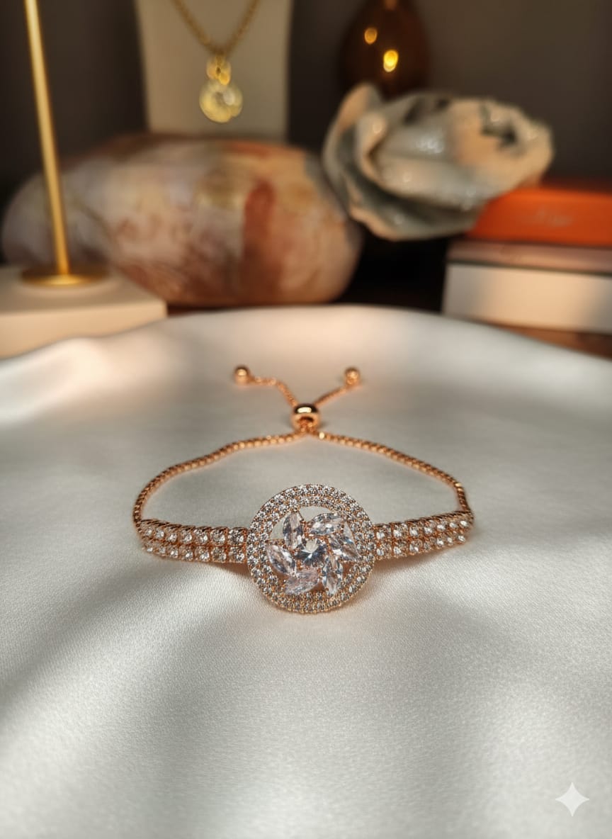 Elegant Rose Gold Adjustable Bracelet for Women featuring a floral marquise zircon centerpiece and double halo detailing — perfect for gifting or glam styling.
