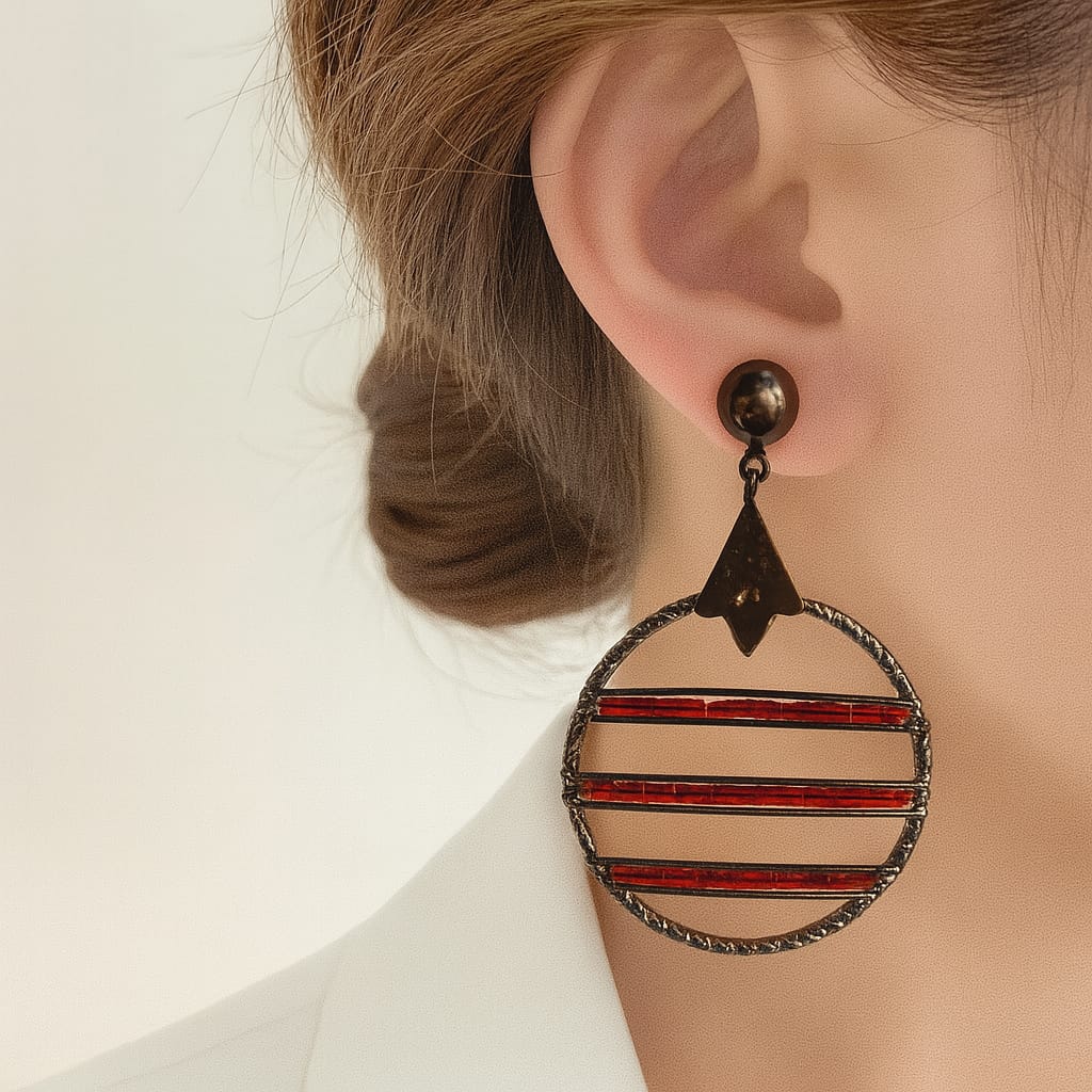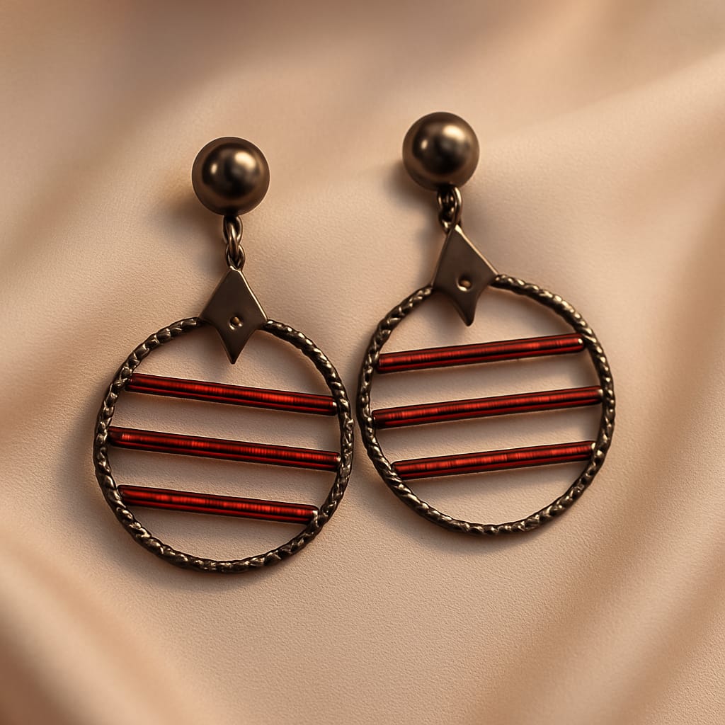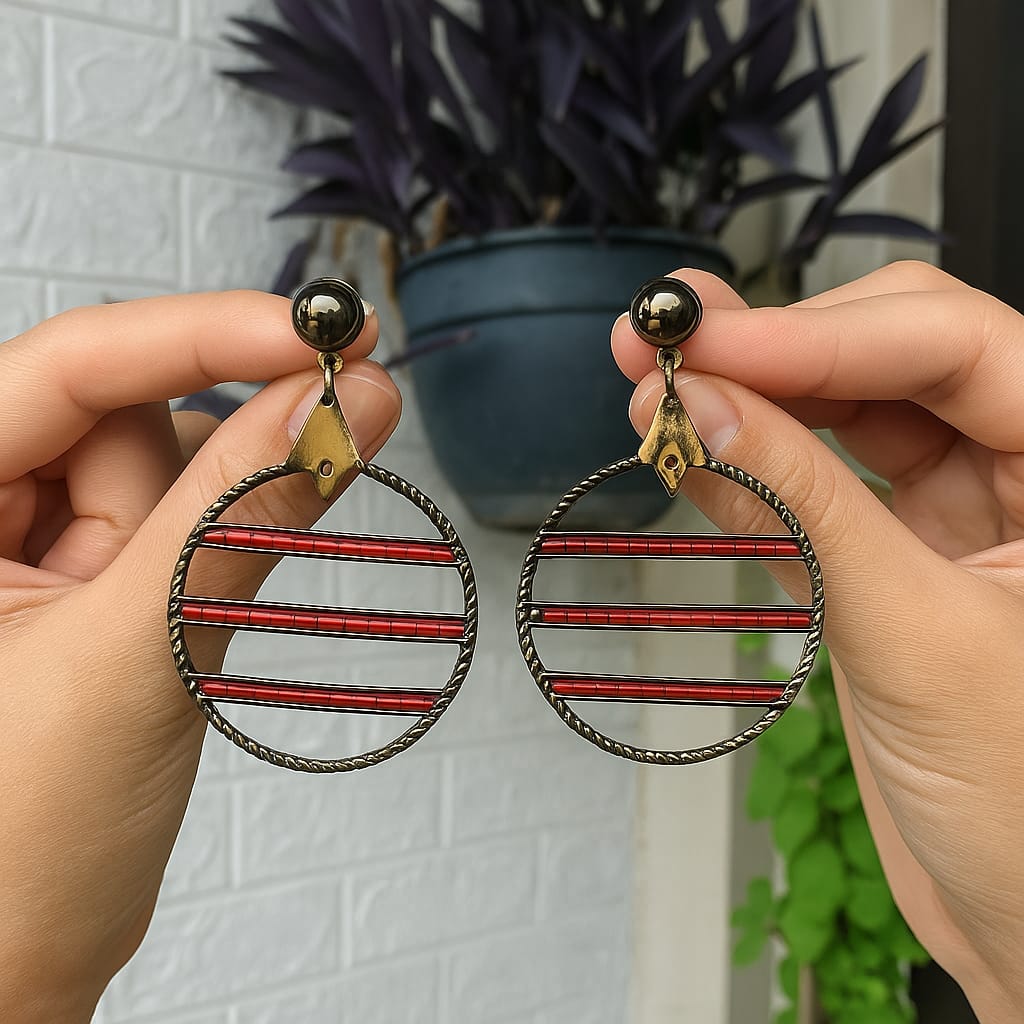 Elevate your accessory collection with our Round Statement Earrings with Red Bars, crafted for women who love bold, fashionable jewellery. Designed with a textured circular frame and three sleek red bar accents, these earrings create a modern geometric vibe that pairs effortlessly with both western and ethnic outfits.